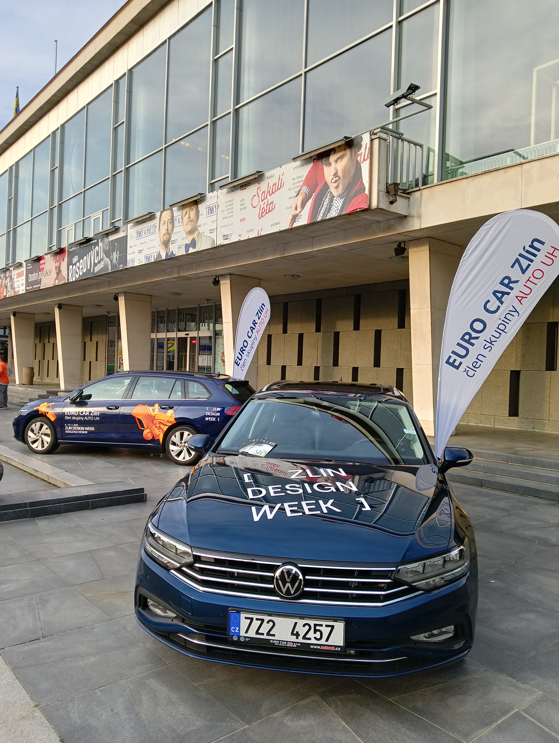 Pro tuto příležitost jsme nechali stylově polepit naše Volkswagen vozy v designu celé akce, které jsme zde buď vystavovali nebo jsme některé z nich, Volkswagen Passat a Volkswagen Golf, propůjčili pro přepravu našich i zahraničních lektorů v rámci Zlína, Prahy a Vídně. Naše vozy jste tak mohli vidět na vlastní oči buď zaparkované tam, kde se v rámci projektu něco dělo, nebo je zahlédnout v akci při svozu z letiště z Vídně, nebo různě na cestách ve Zlínském kraji. Od pondělí 9.5. jsme také staticky vystavovali vůz Volkswagen Touareg, který byl k vidění přímo před Kongresovým centrem ve Zlíně. Vystavení proběhlo při příležitosti celodenní konference.